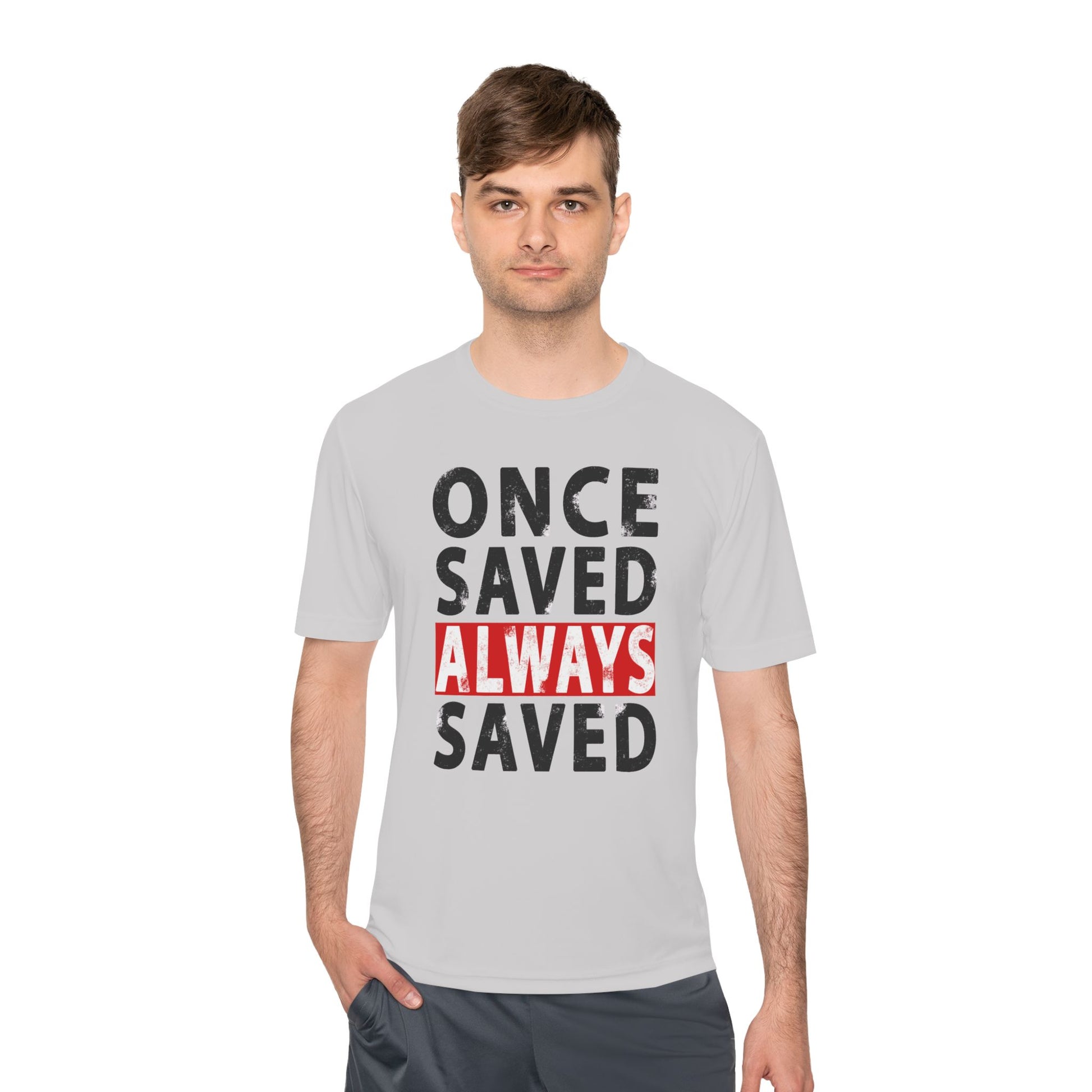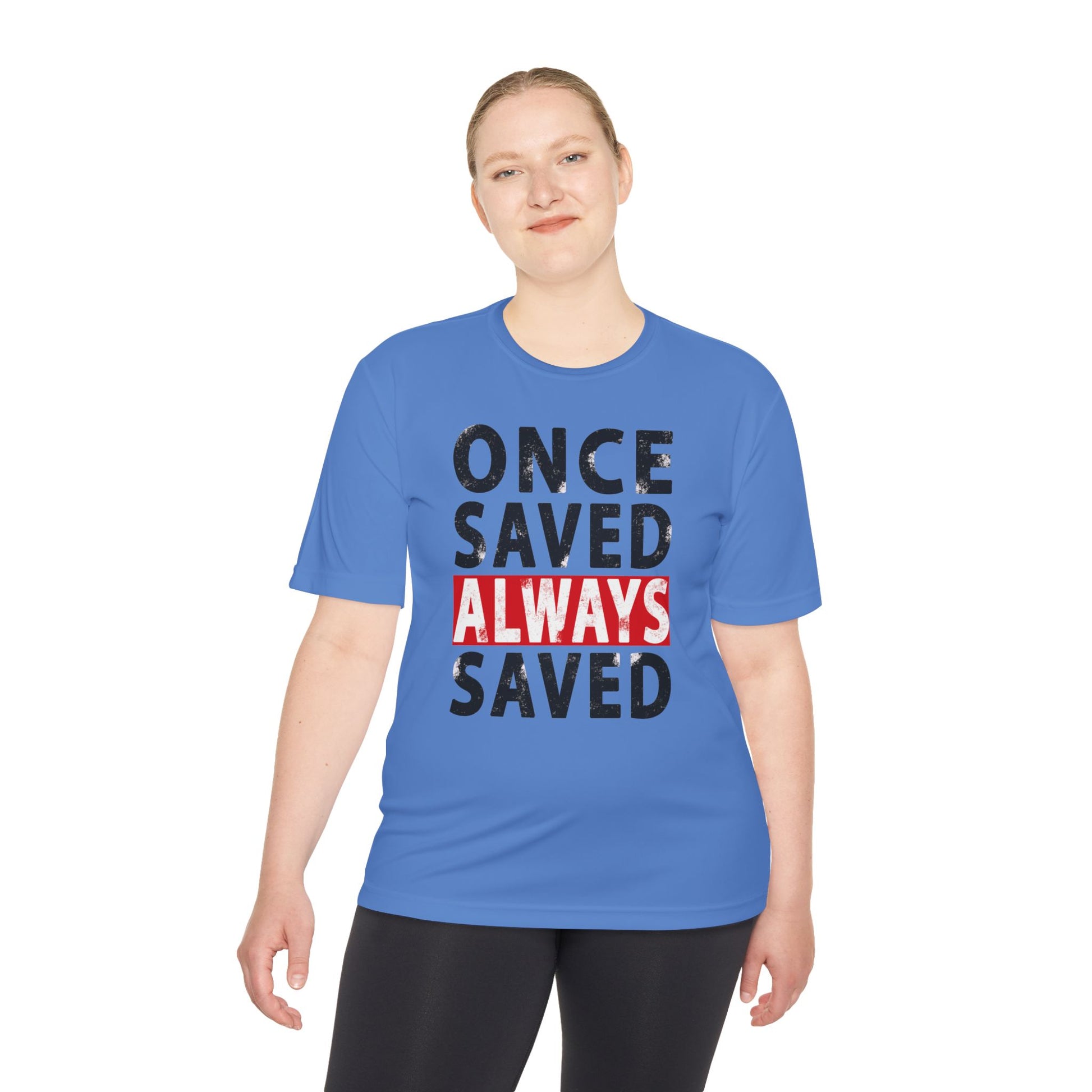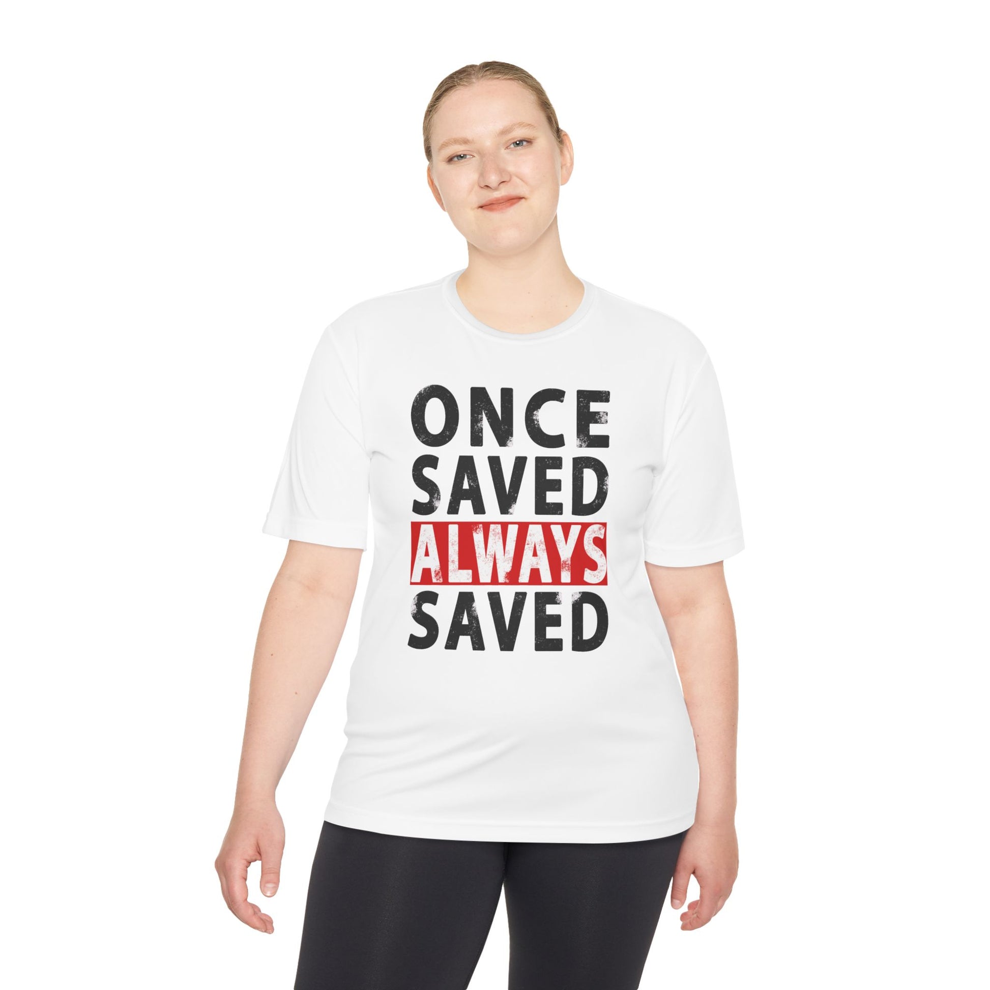 Introducing the perfect blend of comfort and style with this Once Saved Always Saved Dri-Fit Tee. Designed for those who value both function and faith, this tee is great for everyday wear, special gatherings, or sports